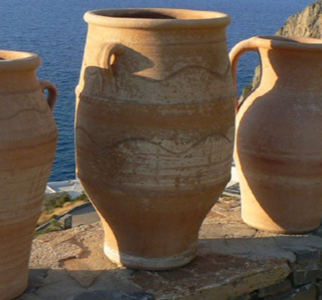 Cretan ceramic pots, 50cm pithos on left, 60cm pithari middle, 50cm Laina on right